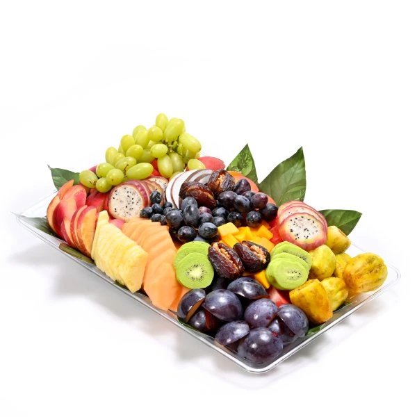 אז מה מגש פירות יכול להכיל? תאנים, תות שדה, ליצ'י, קרמבולה, אבטיח, מלון, אשכולית, קוקוס טרי, ענבים, דובדבנים ועוד פירות הזמינים בעונה. כבר מרגישים את בלוטות הטעם עובדות, נכון? רגע, עוד לא סיימנו – מגש פירות יכול להכיל גם סברס מתוק, אננס, קיווי, פסיפלורה, תפוז ומנגו, ויש לנו גם מטבלים טעימים שאפשר לעטוף בהם את הפירות כדי ליצור חוויית טעמים מטריפה.