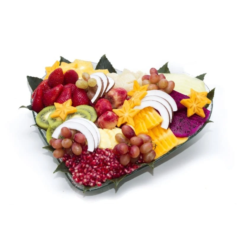 זה בדיוק מה שחיפשתם! פירות מעוצבים מוגשים על מגש זכוכית בצורת לב לולנטיין אוהב ומפנק...