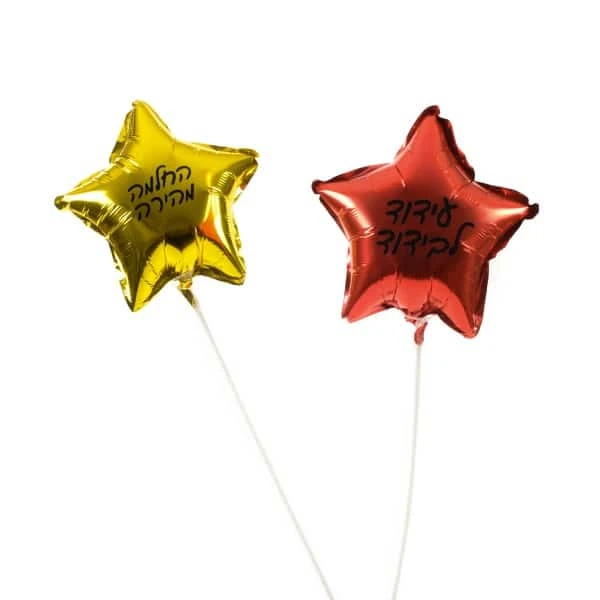 6 בלונים על מקל במבחר צבעים וצורות (לב, כוכב) כולל כיתוב על כל בלון עד 3 מילים. זר הבלונים קשור בסרט