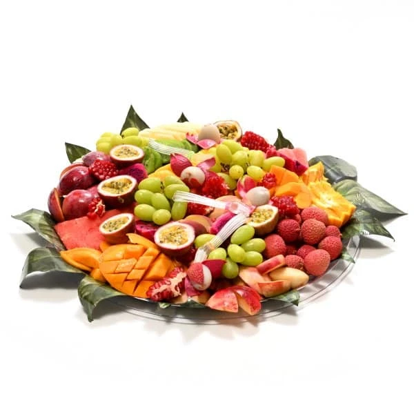 מגש עגול מפנק 45 ס"מ קוטר, שופע במגוון פירות טריים מעוצבים תוספת מיוחדת: תמרים ממולאים באגוזים