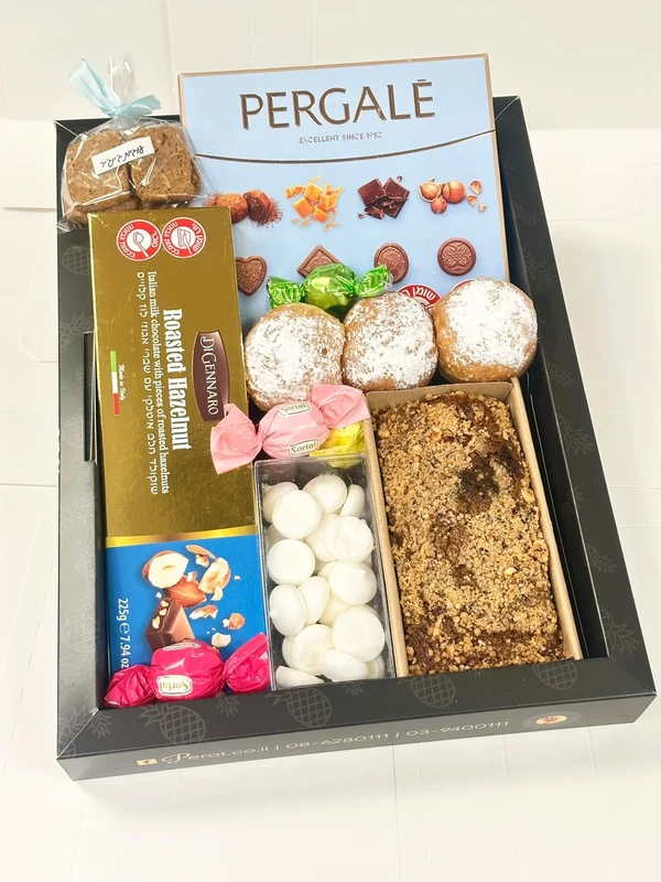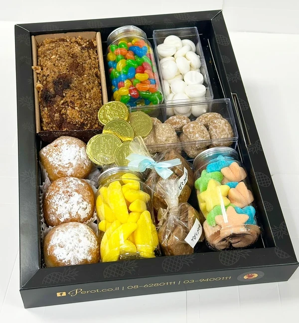 מארז שמח וצבעוני במיוחד לחג החנוכה לכל המשפחה המכיל: 3 סופגניות, עוגת טורט, פרליני שוקולד, עוגיות ג'ינגר, קופסאת נשיקות, מארז פרלינים במבחר טעמים, טבלת שוקולד ענקית במבחר טעמים.