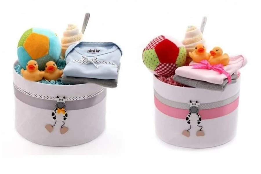 מארז מתנה המכיל: חיתול טטרה 100% כותנה בגד גוף 100% כותנה סינר 100% כותנה מגבת אישית 30*30 ס"מ כפית האכלה איכותית של חברת Nuby אפליקציית עץ דימויי פרה לתלייה ועיצוב בחדר התינוק כדור צעצוע רך וצבעוני עם רעשן עדין (כ-15 ס"מ) שני ברווזוני אמבטיה