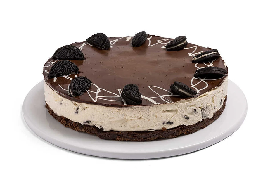 על תחתית של בראוניז, קרם אוראו בציפוי גנאש שוקולד מריר ובקישוט עוגיות אוראו.